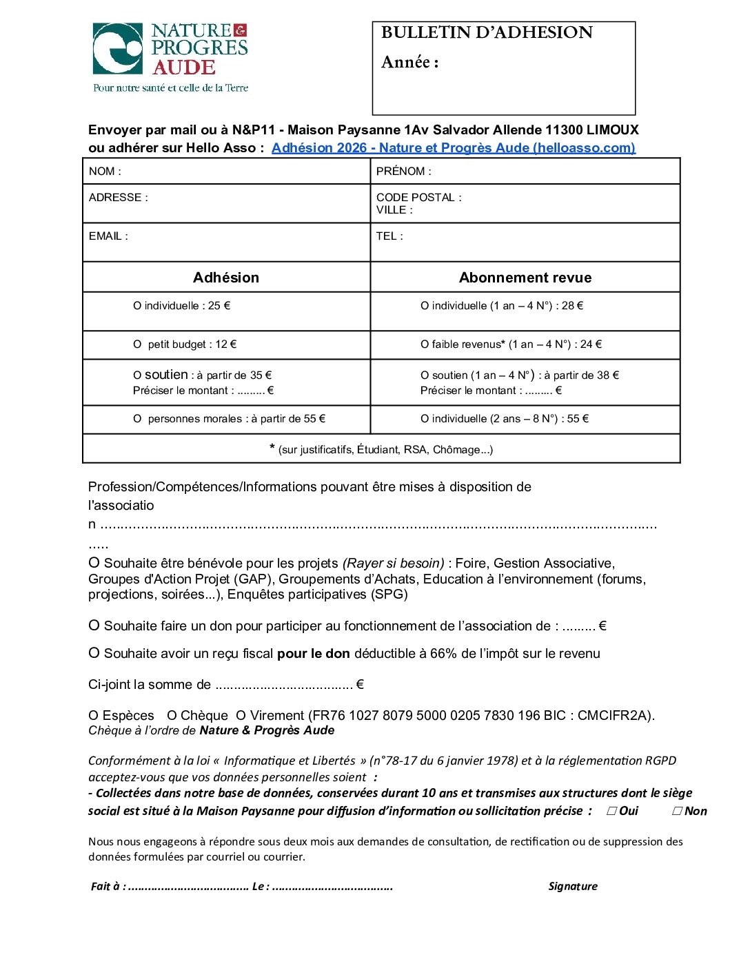 J’adhère à Nature et Progrès 11 Soutenez NP11, adhérez ! Pour télécharger un bulletin d’adhésion PDF, cliquez ici ! Un grand MERCI pour votre soutien !!! ADHESIONS EN LIGNE SUR HELLO ASSO CLIQUEZ ICI !